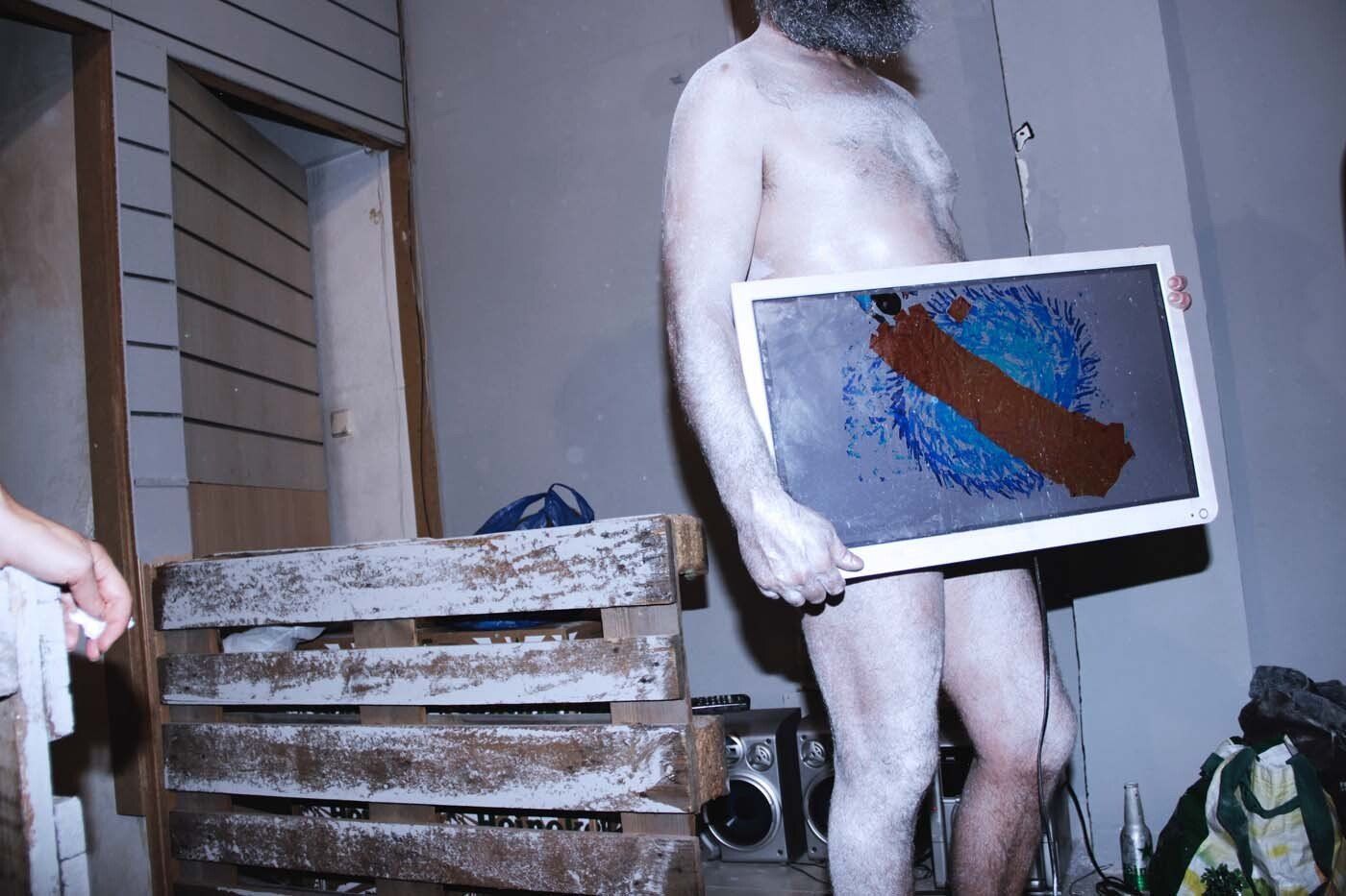 El artista sujeta su obra y el público observa esta obra a la vez que